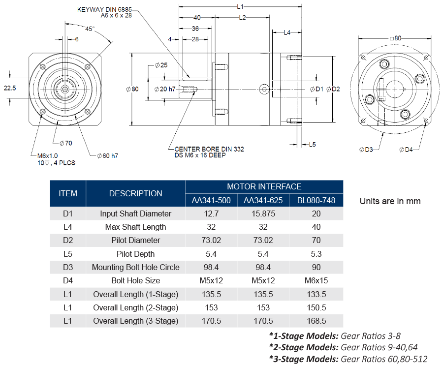 The GBPN-080x Series Planetary Gearbox offers you the precision you need at the prices you want! This Planetary Gearbox is designed with the highest torque density possible for motion control, automation, and robotic applications requiring a compact solution. This planetary gearbox series is an ideal match for the NEMA 34 frame size as well as your servo, stepper, brushless, AC or DC motors. Built with the design goal of offering a cost effective product without sacrificing quality, you will find that this Planetary Gearbox offers you an extraordinary value. You will find online prices on this website along with all the information you need to know to select the perfect Planetary Gearbox for your applications. Please verify all dimensions when matching a gearbox to a specific motor, as critical dimensions will vary among series and manufacturers.