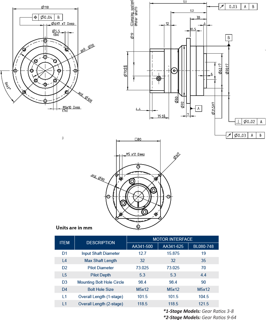 For custom input dimensions, or non-Anaheim Automation motors, fill out our Gearbox Mounting Form and submit it to our Sales Engineers at [email protected]