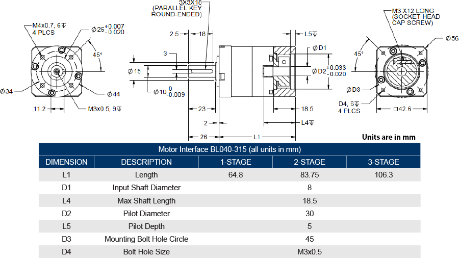 Motor interface BL040-315 is compatible with Anaheim Servo Motor series KNC-SRV-SMC40S and KNC-SRV-SMH40S. Choose a gearbox item from the product table above, and then select the appropriate motor interface ("suffix") on the individual product page to create a complete gearbox part number. The BL040 has replaced the old SMH40 designation. All dimensions between the two part numbers are the same.