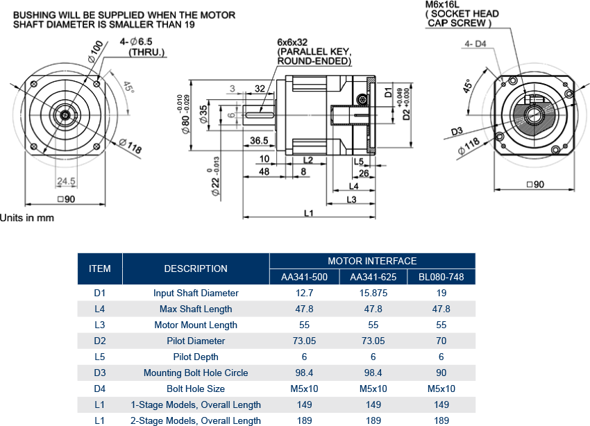 The GBPS-090x Series is an In-Line Planetary Helical Gearbox line that offers great prices without sacrificing precision and quality. The GBPS-090x Series is designed for motion control applications requiring moderate backlash and stiffness. Features include backlash as low as 3 arcminutes, 22 gear ratios for rated torque up to 1328 in-lbs (21,248 oz-in), (model dependent), a precision clamping system and lifetime lubrication. Please verify all dimensions when matching a gearbox to a specific motor, as critical dimensions will vary among series and manufacturers.
