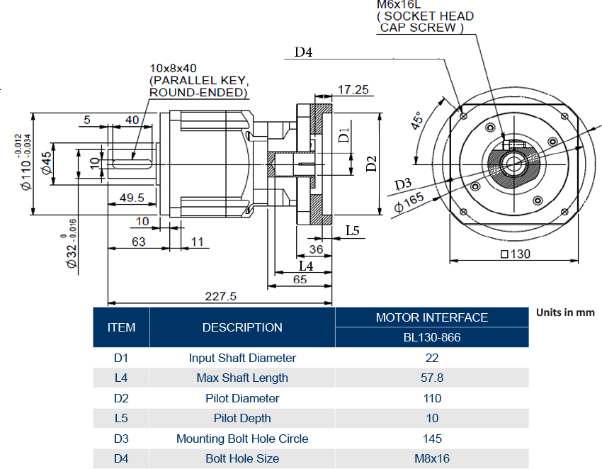 The BL130-866 mounting flange is compatible with KNC-SRV-SMC130 servo motors.