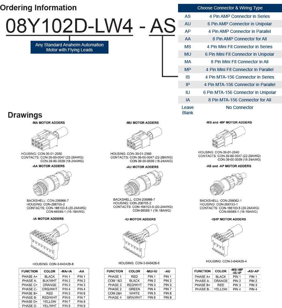 Anaheim Automation offers four different series of MTA-156 Style Connectory Adders. Ideal for applications requiring wire-to-wire configurations, these Connector Adders offer polarized housings, completely isolated terminals, and RoHS compliance! These Connector Adders cannot be purchased separately, rather they can be added to a part number as an option. Please see chart below for assistance in constructing a part number; Application Engineers are available to support you in product selection.