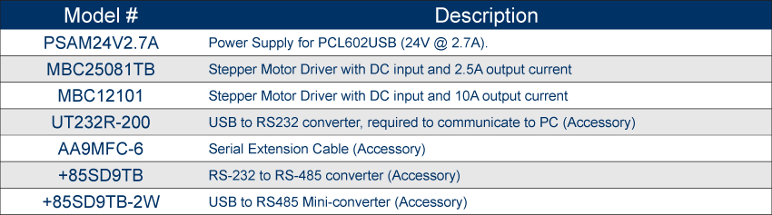 The PCL602 is a dual-axis step motor controller containing 2 Kbytes of nonvolatile stored programming space and quadrature encoder feedback. This device provides flexible and independent control of stepper motors from computers or any machine controller with a USB port. More specifically, the PCL602 presents an easy way to implement motion systems requiring two axes and the precision that can be achieved on each axis through the use of encoder feedback. Accessories such as a TWS7 (7 decade thumbwheel switch) and AA9MFC-6 (serial port cable), are purchased separately. See Accessories on this website for details.